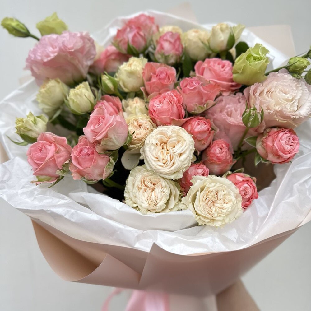 Кустовая роза - 7 шт. Эустома - 2 шт. Лента атласная - 1 шт. Упаковка дизайнерская - 1 шт.