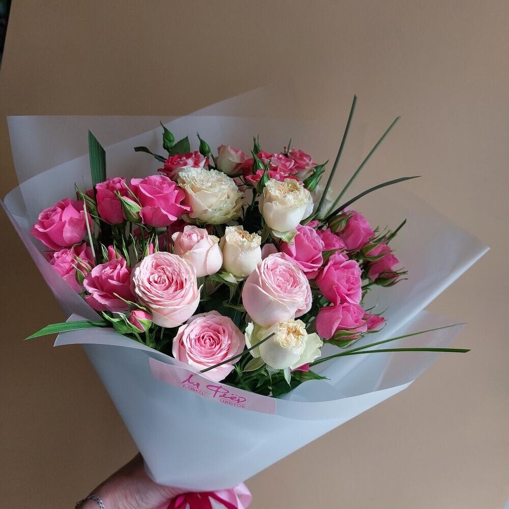 Кустовая роза - 5 шт. зелень декоративная - 1 шт. дизайнерская-упаковка - 1 шт.
